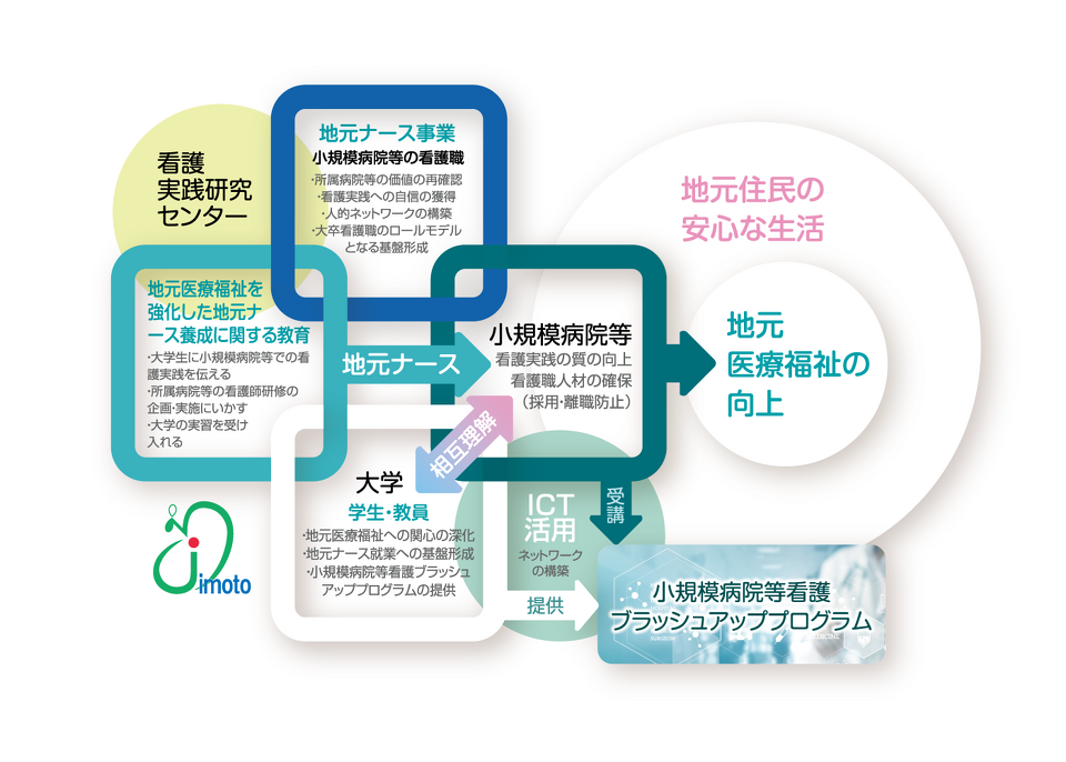 小規模病院等に勤務する看護職を対象とした教育支援を行います。実践能力の向上を図るリカレント教育の内容・方法を開発するとともに、リカレント教育修了者が地元ナースのロールモデル(地元ナースRM)としての役割を担い、小規模病院等で臨地実習を展開できるための基盤を形成します。
