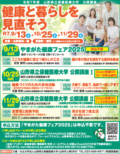 | 開催日時・会場 | 山形会場(山形県立保健医療大学):2025年10月25日(土)13:00~15:00 米沢会場(山形県立米沢栄養大学):2025年11月29日(土)13:00~15:00 |