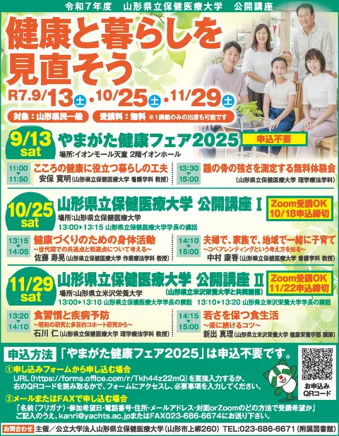 山形県立保健医療大学では、地域の皆さまの健康増進と生活の質の向上を目的とした「令和7年度 公開講座」を開催いたします。
