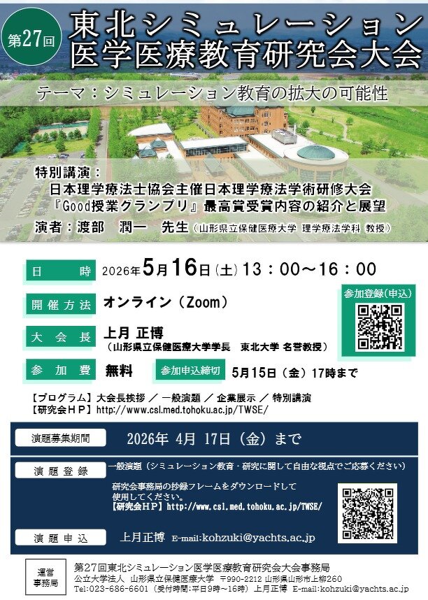 第27回東北シュミレーション医学医療教育研究会大会が本学講堂を会場に開催されます。 詳細は下記のチラシをご覧ください。