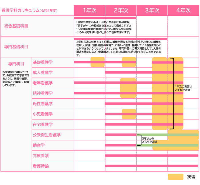 看護学科では、看護師に加えて助産師または保健師の受験資格も得られるためのカリキュラムがあります。地元探求、チーム医療論といった広い枠組みで健康と医療を捉える科目構成や、台湾やアメリカの大学との交流協定による世界への扉が身近にあります。また、キャンパス移動がなく1年から看護学科教員の科目があり、安定的な環境で実践応用力や思考力の基盤を高めることができます。