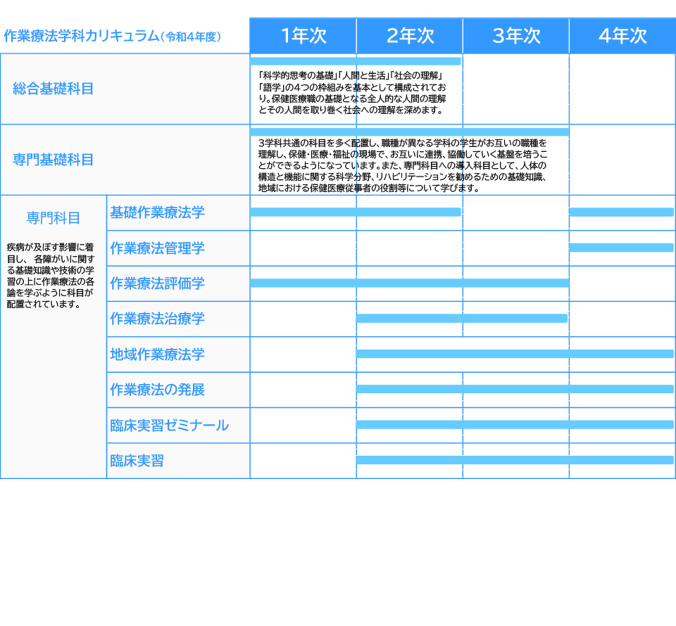 私たち作業療法学科教員は、対象者の心身機能・活動・参加という生活機能全体を、対象者を取り巻く環境にも目を向けながら、科学的・創造的に思考し探求できる専門的知識と技術を教授いたします。そして、医療機関や福祉施設のみならず、対象者が生活する地域の中で作業療法を実践できる人材の育成を目指しております。