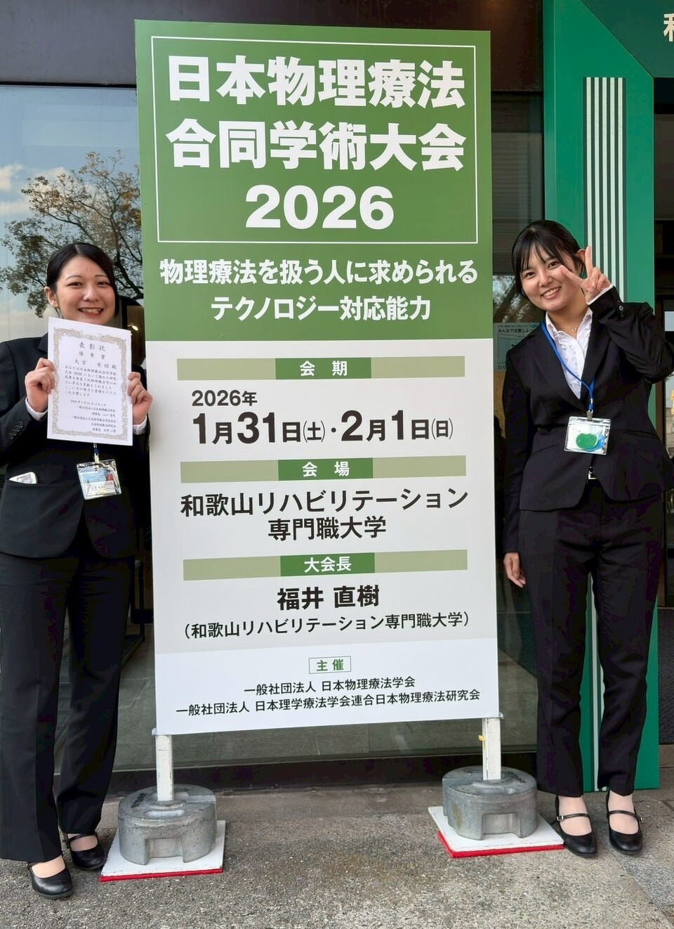 作業療法学科の仁藤充洋教授と大学院生(博士前期課程1年)の設楽奏有さん、大宮有結さんが1月31日(土)~2月1日(日)に和歌山市で開催された日本物理療法合同学術大会2026に参加し、研究成果を発表しました。