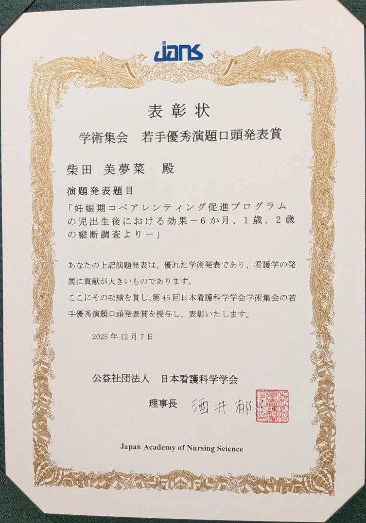 大学院博士前期課程の柴田美夢菜さんが、第45回日本看護科学学会学術集会にて、若手優秀演題口頭発表賞を受賞しました。