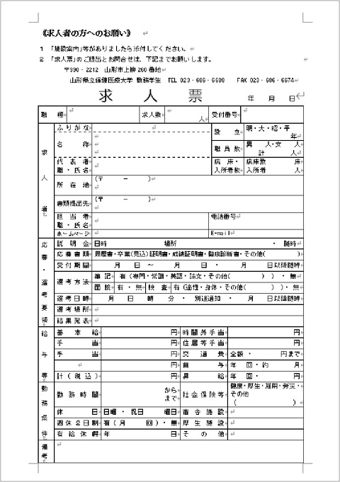 本学に求人を出す場合は、貴施設の様式又は下記の様式をご利用ください。
